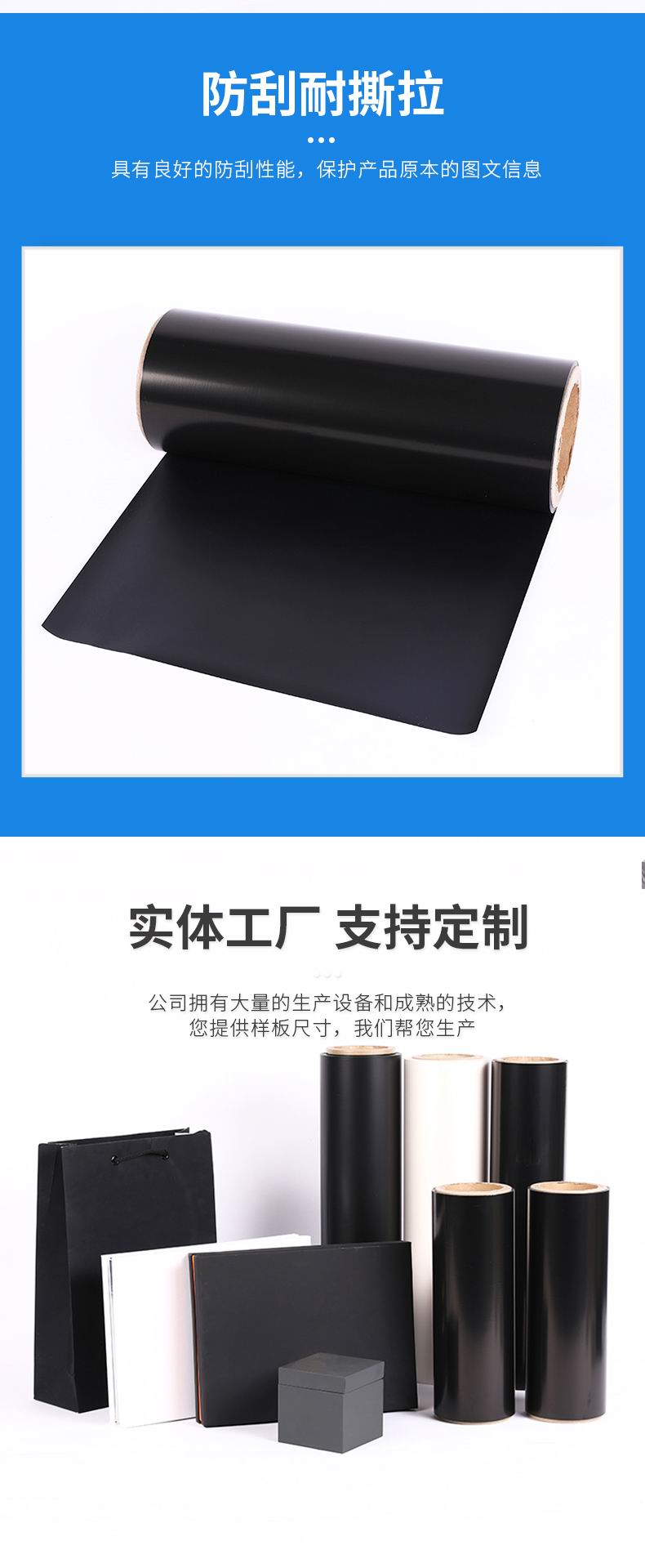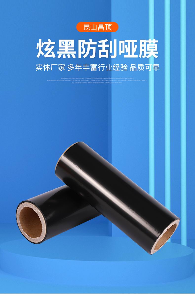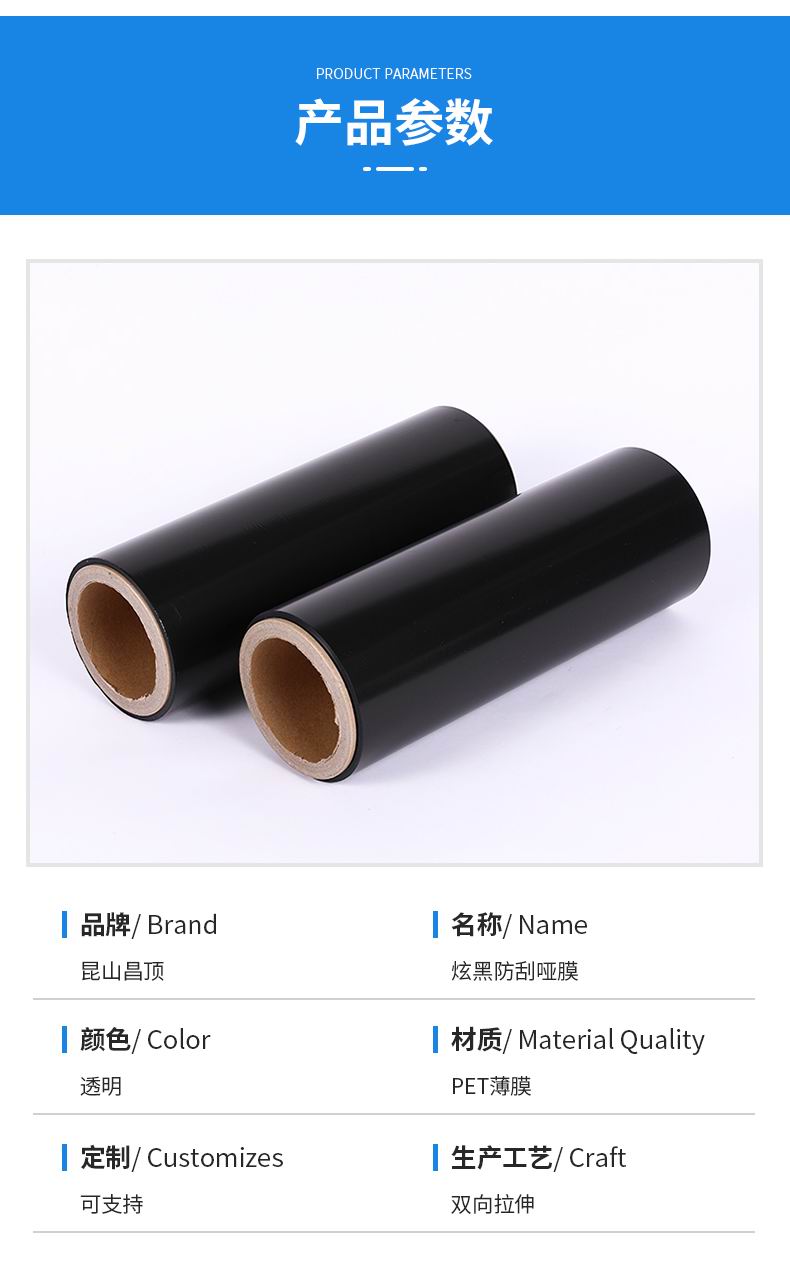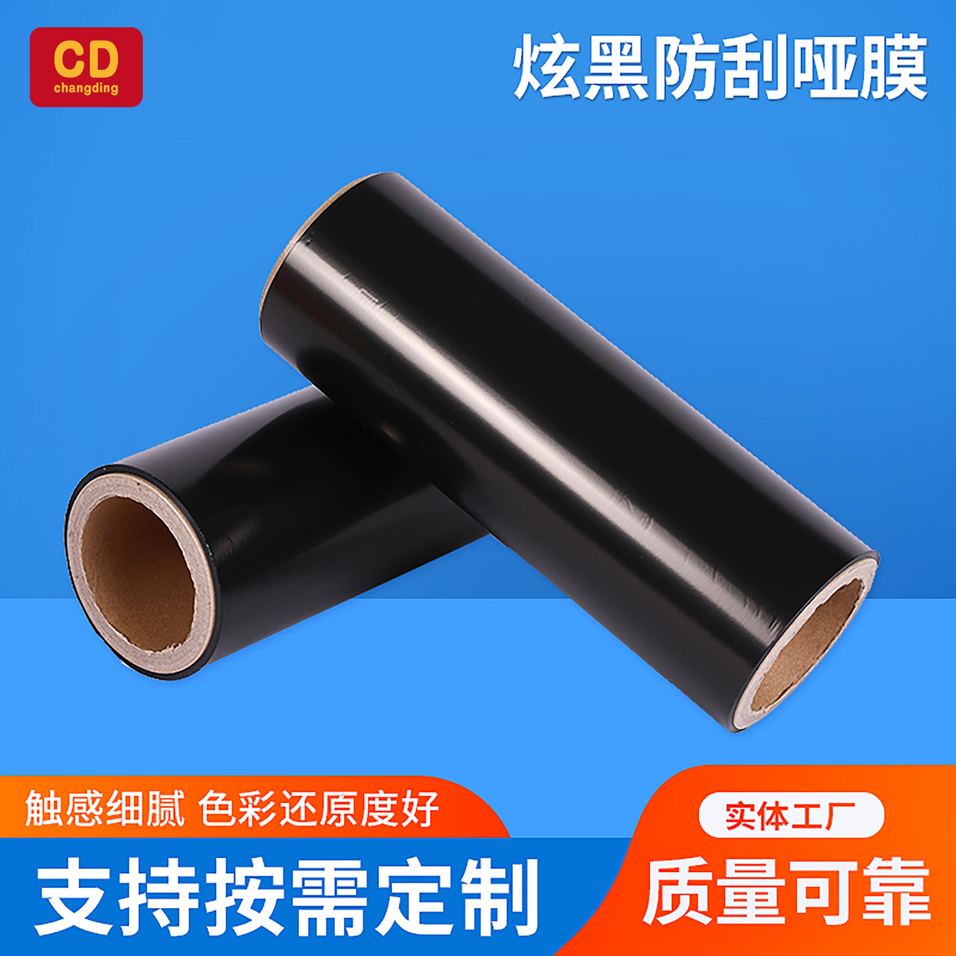 該材料通過特殊工藝處理在薄膜表面做成黑色,可做成防刮,觸感等效果,具有一定滑爽度的抗刮層,另一面經(jīng)電暈處理組成,特別適合于制作精美包裝盒、電子產(chǎn)品包裝盒、封面、展示盒、手提袋等。