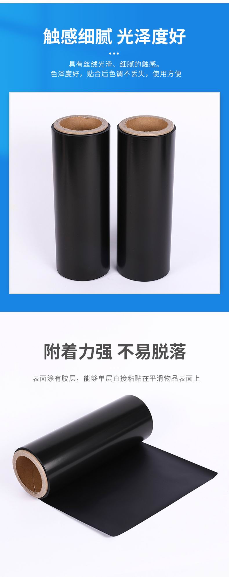 1.使用方法同普通啞膜,但相比普通膜,黑色功能膜更適合滿版色印刷覆膜,顏色更純正,且具體有一定的耐磨防刮效果,黑色觸感膜具有特殊絲絨光滑、細(xì)膩的觸感;